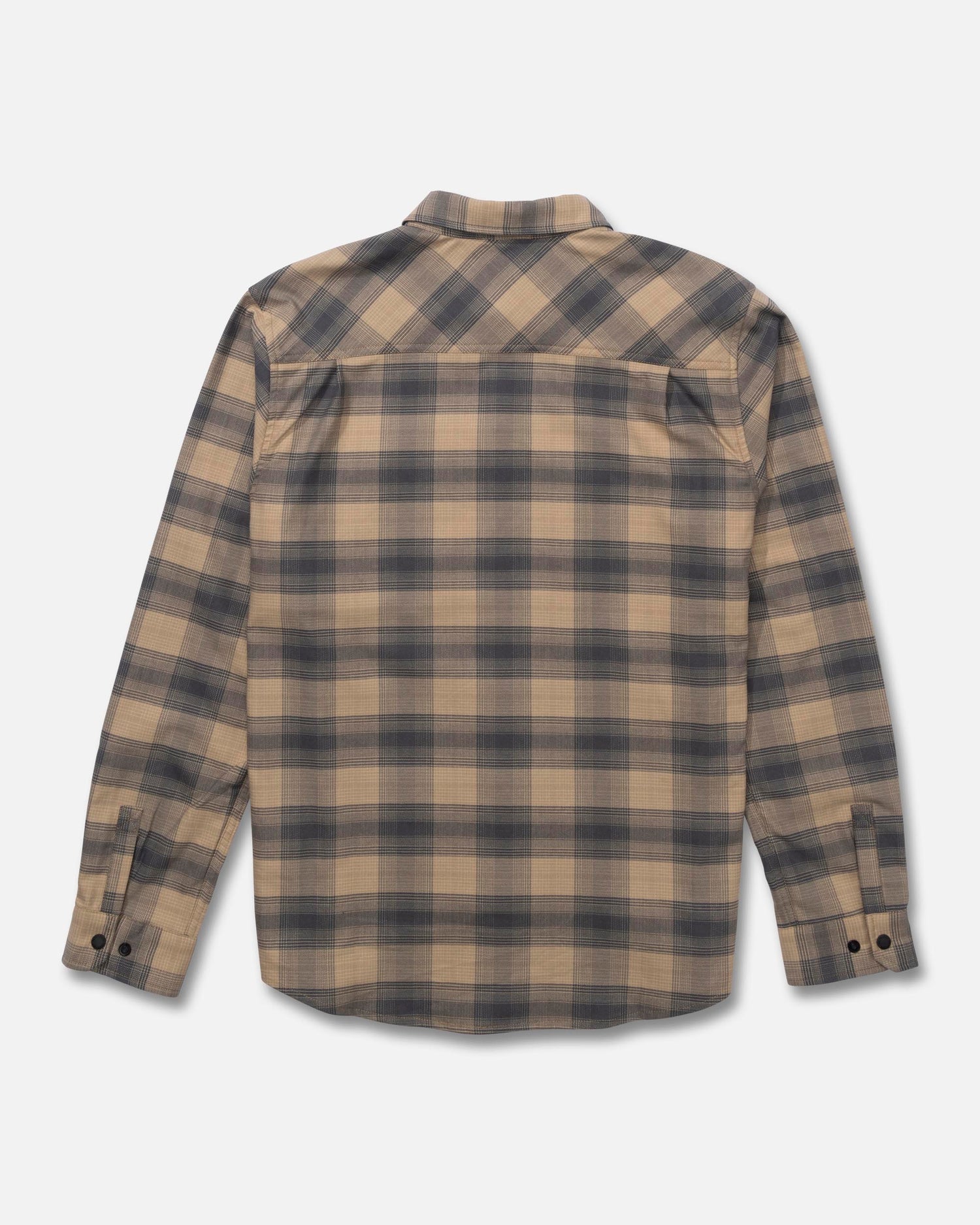 The Fathom Long Sleeve Tech Flannel in Khaki is made from yarn-dyed check fabric with a two-piece collar. It features chest pockets, snap buttons at the center front, and a relaxed fit for functional, all-day wear.
